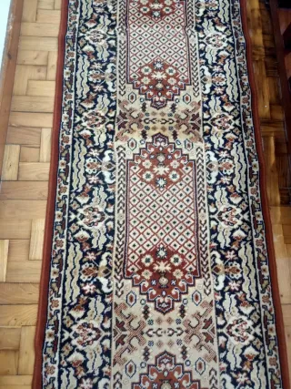 Alfombra de pasillo con un diseño clásico y elegante de 7,40 m x 0,7m (centímetro arriba, centímetro abajo porque no tengo un metro tan largo). Perfecta para dar un toque de estilo a tu hogar. Se encuentra en muy buen estado salvo un leve enganche a unos 70cms del final que reflejo en una foto. Tengo una alfombra con mismo dibujo del mismo ancho pero más larga aún. - Diseño alargado ideal para pasillos. - Patrones intrincados en tonos beige y rojo. SI SE LLEVAN TODAS LAS ALFOMBRAS QUE TENGO EN VENTA DE UNA VEZ, LAS DEJO TODAS A 100€ LA UNIDAD #alfombra #camino #persa