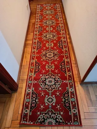 Alfombra de pasillo con un diseño tradicional y colores vibrantes. Se encuentra en buen estado(medidas 3'05 x 0'70)- urge venta - Diseño con motivos geométricos y florales. - Borde decorativo a lo largo de los laterales.