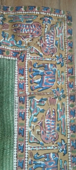 Alfombra de yute indú verde con un borde añadido de algodón diseño oriental en tonos ocres y azules. Reversible. Sin roces, en buen estado. - Borde con motivos de elefantes y pájaros - Textura de algodón tejido.