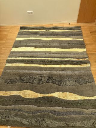 Alfombra de salón con diseño de rayas onduladas. - Medidas: 230 x 165 cm. - Tonos gris y beige - Precio original: 1.100€ aprox - Lavado de tintorería