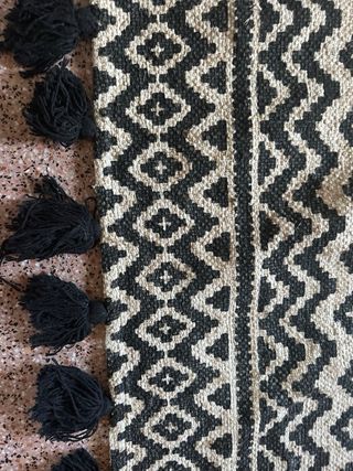 Alfombra de tela con un diseño inspirado en motivos árabes. - Borde decorativo con puntos azules. - Motivos geométricos y jeroglíficos en tonos amarillos y azules.