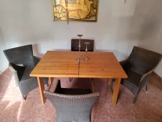 Mesa de pino con 4 sillas de mimbre
