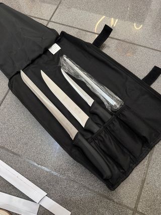 Vendo set de cuchillos profesionales ELPOZO, ideales para carnicería, cocina profesional o para el que se tome el filete muy en serio 😄 🔪 Incluye: • 3 cuchillos ELPOZO de distintos tamaños • 1 chaira (afilador) • Funda enrollable original para transporte y almacenamiento