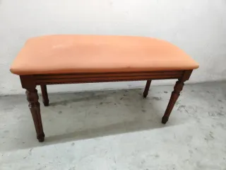 Banqueta de dormitorio con un diseño elegante. - Tapizado en tela color naranja. - Patas de madera oscura. - Estructura con detalles tallados.