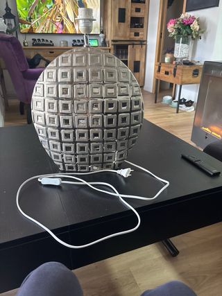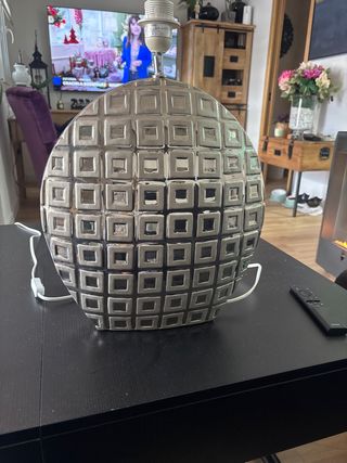 Elegante lámpara de mesa con un diseño moderno y llamativo. Su acabado le da un toque sofisticado a cualquier espacio. - Base con diseño geométrico. - Portalámparas listo para usar.