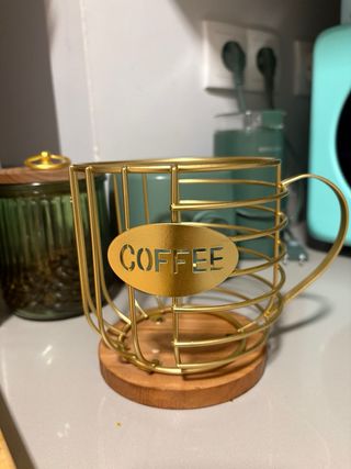 Elegante porta cápsulas de café con un diseño de alambre dorado y base de madera. - Estructura de alambre dorado. - Base redonda de madera. - Detalle de la palabra COFFEE troquelada.
