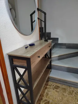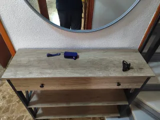Mueble recibidor con un diseño moderno y funcional. - Estructura principal en metal negro. - Tableros y estantes en madera con acabado rústico. - Dos estantes abiertos para almacenamiento. - Un cajón con tirador. - Patas con diseño cruzado en los laterales.