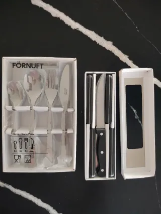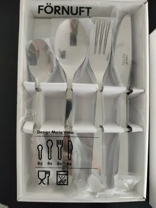 Set de cubiertos de la marca FÖRNUFT, con un diseño moderno y elegante. - Incluye cucharas, tenedores y cuchillos. - Mango de plástico negro y partes metálicas plateadas.