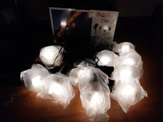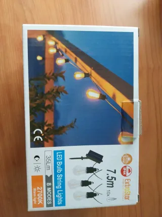 (..Pack 3 cajas ..) luces LED solares de 7.5 metros de longitud, perfectas para exteriores. Cuentan con 8 modos de iluminación y emiten una luz cálida de 2700K. - Longitud total: 7.5m - 8 modos de iluminación - Temperatura de color: 2700K (luz cálida) - Alimentación solar con panel IP44 - Incluye 10 bombillas