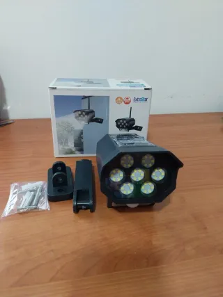 Esta luz solar tiene un diseño que imita a una cámara de seguridad, ideal para disuadir. - Funciona con energía solar. - Incluye soportes y tornillos para su instalación.