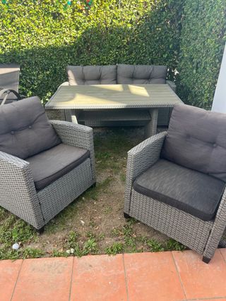 Conjunto de muebles de exterior para terraza o jardín. - Sofá de dos plazas. - Dos sillones individuales. - Mesa de centro con estante inferior. Se recoge en el condado de alhama