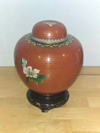 Precioso jarrón de cerámica con técnica cloisonné, decorado con una llamativa flor azul y detalles dorados. 18 cm de alto 15 cm de diámetro - Diseño floral detallado. - Base de madera incluida.