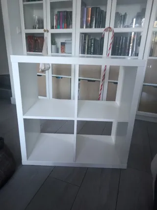 Estantería modular de la marca Ikea, modelo Kallax. Su diseño versátil permite colocarla tanto en vertical como en horizontal. - Múltiples compartimentos para almacenamiento. - Acabado en blanco.
