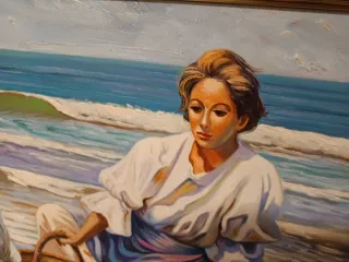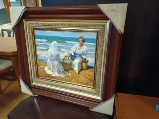 Cuadro original de A.frances que representa una escena de playa con dos mujeres. La obra está enmarcada en madera con detalles dorados. - Marco de madera con acabado en tonos marrones y dorados. - Representación de una escena costera con figuras humanas. Distintos artistis y estilo pregunta precio Nuevo a estrenar..somos tienda ..estamos liquidando