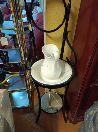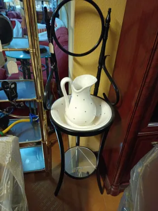 Lavabo de pie con un diseño clásico y elegante. - Base de madera negro. - Cuenco de cerámica blanca con detalles. - Soporte con forma curva. Aún con el espejo sin montar Nuevo a estrenar..somos tienda ..estamos liquidando