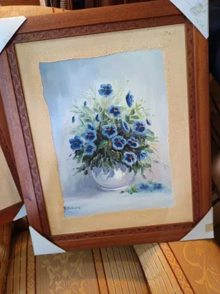 Pareja cuadros madera flores pintura