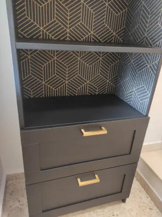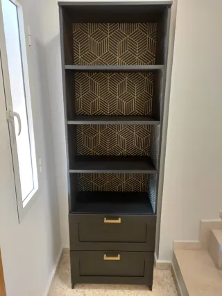 Librería de IKEA serie Brimmes en color negro, con un diseño personalizado que combina papel con patrón geométrico y tiradores en dorados. Tiene tres estantes y dos cajones inferiores con gran capacidad. Se incluyen tiradores negros originales sin uso. Ha tenido uso como mueble recibidor, es muy versátil, queda bien en cualquier ambiente. Muy original. Bien conservada, sin desconchones de la pintura, pero con algunos harazaños/roces en papel (como los que se muestran en las últimas fotos). Solo venta en persona.