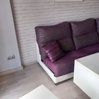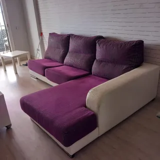 SOFA CHESLONG de 2 partes ensamblables, un sofa de 2.30x75x75 y un cheslong de 1.60x70x75, con un diseño moderno y elegante, tapizado en tela con bonitos relieves en color morado, y polipiel de calidad de color blanco roto, con tan sólo algunos signos de desgaste en la polipiel de las esquinas de sus reposabrazos. Se encuentra en Torremolinos, en la zona alta de Montemar.