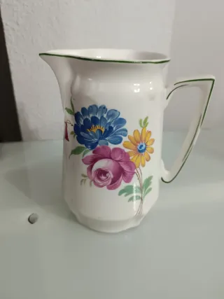 Precioso jarrón vintage con un diseño floral vibrante. - Decorado con flores en tonos azules, rosas y amarillos. - Borde y asa con detalles - Pieza de porcelana con un acabado brillante.En muy buen estado