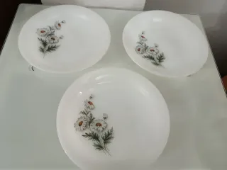 Conjunto de seis platos hondos de opalina de la marca Arcopal. Presentan un delicado diseño floral de margaritas. - Diseño floral de margaritas.