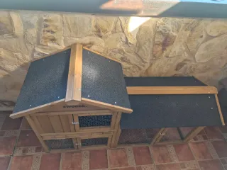 Casa de madera para conejos o animales pequeños, con dos plantas y tejado. - Fabricada en madera. - Diseño de dos niveles. - Tela asfaltica en tejado. Esta como nuevo.