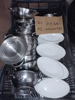 Lote de vajilla y coladores. - 21 piezas de vajilla.2 unidades 1€ - 52 conchitas.3 unidades 1€ - Coladores de metal.