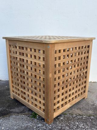 Baúl de madera con un diseño de rejilla. - Tapa con patrón cuadriculado. - Laterales con diseño de rejilla. - Estructura de madera.