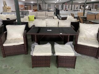 Conjunto de ratán en color marrón, ideal para terraza o jardín. Nuevo a estrenar. - Mesa con superficie de cristal. - Incluye asientos y cojines.