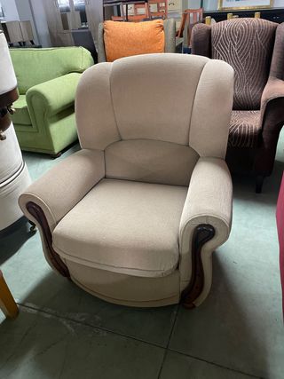 Butaca individual de tela en color beige. Un asiento acogedor con detalles de madera. - Diseño clásico y elegante. - Acolchado confortable.