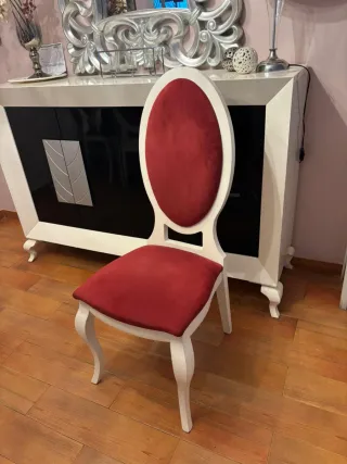 6 Elegantes sillas para mesa de comedor con un diseño clásico. - Tapicería de terciopelo suave. - Estructura de madera robusta. - Combinación de colores rojo y blanco. 200€ las 6 sillas