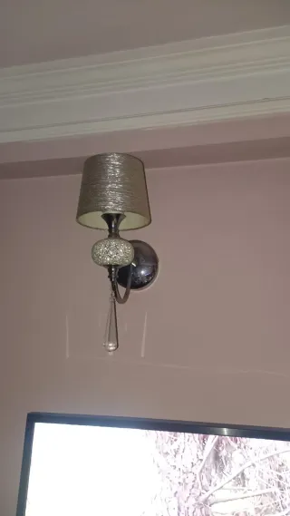 Elegante aplique de pared con un diseño moderno y sofisticado. 30 € cada uno - Acabado plateado brillante. - Detalle de cristal colgante. - Base metálica redonda.