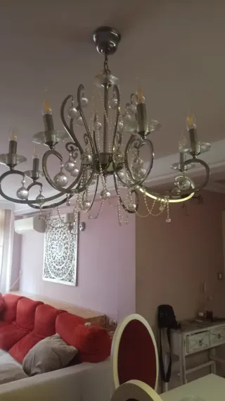 Elegante lámpara de araña con un diseño sofisticado. Precio negociable - Acabado en plata brillante. - Detalles en cristal transparente. - Estructura robusta de metal.