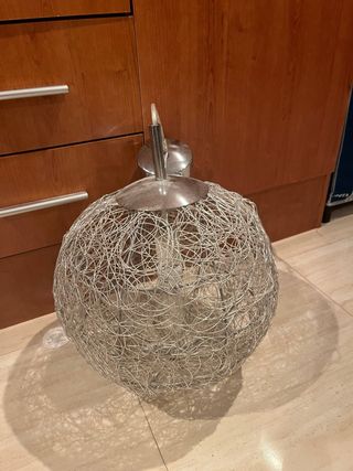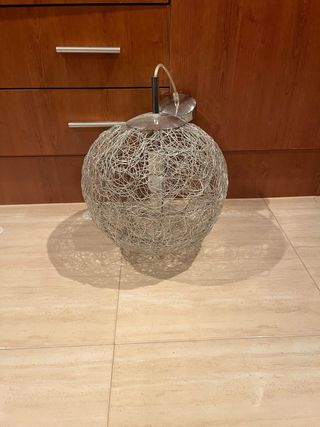 Lámpara de diseño con una estructura esférica de alambre entrelazado. - Acabado metálico plateado. - Base y soporte de metal. - Estilo moderno y decorativo.