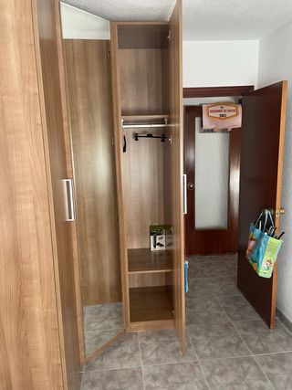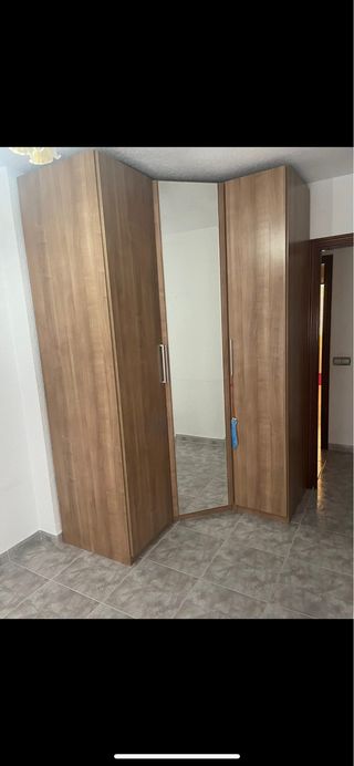 Armario rinconero de madera en perfecto estado. Ideal para aprovechar espacios. - Tiene un espejo en la puerta central. - Dispone de dos puertas a ambos lados del espejo. - Ofrece amplio espacio de almacenaje. medidas de alto 240 ancho 1 puerta mide 42 otra 51 y otra 60