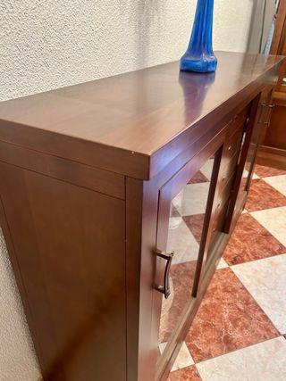 Bonito aparador de madera color marrón con cuatro cajones y una parte superior de cristal. Está en buen estado. - Tiene un diseño elegante y clásico. - Ideal para cualquier habitación de la casa. - Perfecto para almacenar objetos y decorar.