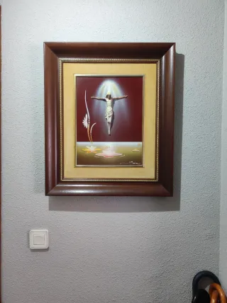 Precioso cuadro religioso de Jesús Cristo con un marco de madera. - Medidas: 65 x 55 cm. - Figura de Jesús en relieve - Marco de madera con detalles dorados. Entre el marco de madera y la tira dorada lleva terciopelo (le han salido unas manchitas "adjunto foto", se ha llevado mucho tiempo guardado, NO es humedad, de quitar sería con algún producto para limpiar en seco o cambiarle el terciopelo) El marco no está dañado. "El que lo compre puede estar tranquilo porque lo envolvería en bolsa burbuja y bien empaquetado" El marco solo ya vale lo que pido