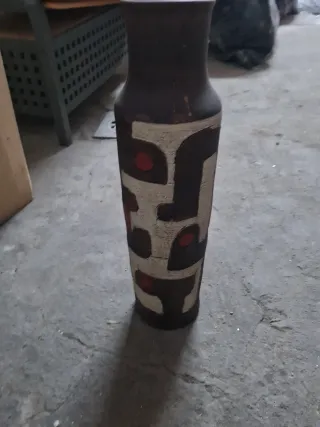 Jarrón de cerámica de gran tamaño con un diseño abstracto y llamativo. Sus colores y formas lo convierten en una pieza decorativa única. - Diseño con formas geométricas y círculos. - Tonos marrones, blancos y toques rojos.