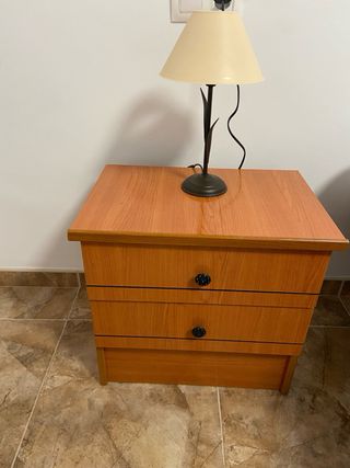 Conjunto de muebles de madera que incluye una cómoda y dos mesitas. - Cómoda de cuatro cajones. - Dos mesitas auxiliares. - Acabado en madera.