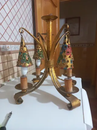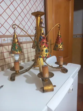 Lámpara artesanal de forja, con un diseño rústico y detalles multicolores. - Estructura principal en tono dorado. - Conos decorados en diferentes colores. - Soportes de bombilla imitación a una vela