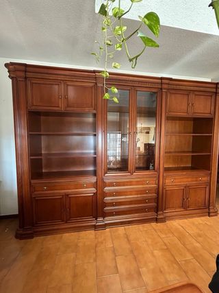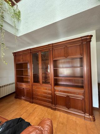 Bonito mueble de salón de color cerezo, ideal para colocar la televisión y otros elementos decorativos. Está compuesto por un mueble bajo con cajones y puertas, una estantería superior con puertas de cristal y baldas, y dos vitrinas con puertas de cristal. Se encuentra en buen estado. - Mueble para TV con estantes y vitrinas. - Diseño elegante y funcional. - Perfecto para organizar el salón.