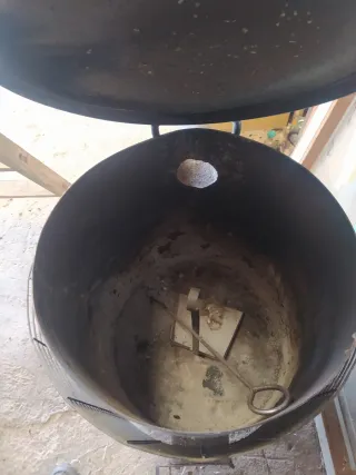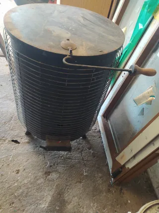 Estufa de leña con un diseño cilíndrico y una rejilla protectora. - Estructura principal de metal. - Asa de madera para facilitar su manejo. Es muy grande, sole le hace falta una mano de pintura, está nueva y calienta muchísimo