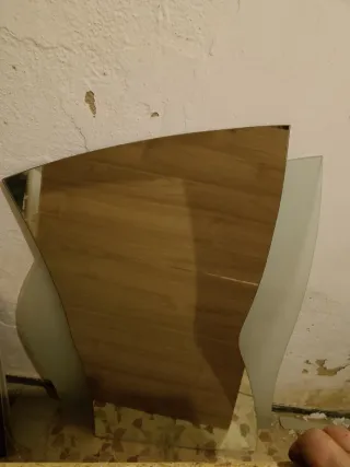 Elegante espejo decorativo con un diseño moderno y llamativo. Su combinación de materiales aporta un toque sofisticado a cualquier espacio. - Pieza central con acabado en madera. - Base de mármol con incrustaciones. - Diseño curvo y asimétrico.