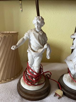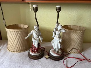 Conjunto de dos lámparas de mesa antiguas con figuras de porcelana. - Figuras de porcelana detalladas. - Pantallas de tela.