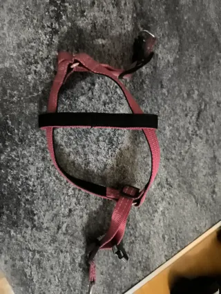 Arnés para perro de tamaño pequeño. - Diseño con correas ajustables. - Color rosa/ antirrefectante - Cierre de clip. - Anillas metálicas para enganche. - Acolchado y con neopreno Solo un par de usos, se le quedó pequeño a mí perro. No sé hacen envíos