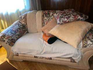 Conjunto de dos sofás de estilo clásico, uno de tres plazas y otro de dos. - Diseño elegante con detalles florales. - Tapicería de tela en tonos beige y multicolor. - Estructura de madera. Se entrega en Almagro, no se envia. SI LO QUIERES, HAS DE VENIR A RECOGERLO.