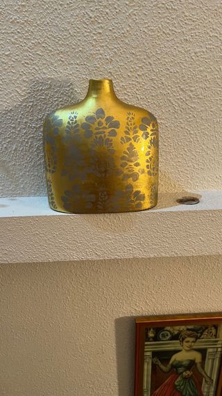 Elegante jarrón de porcelana con detalles dorados, fabricado por Ramgi en Manises. Su diseño único añade un toque de distinción a cualquier espacio. - Acabado brillante. - Borde ondulado con filo dorado. - Motivos florales en relieve.