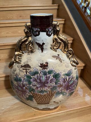 Elegante jarrón de cerámica con un diseño llamativo. Presenta dragones dorados en relieve y detalles florales en tonos morados. - Asas con forma de dragón. - Decoración de flores y pájaros. - Acabado brillante.