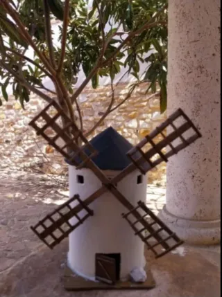 Precioso molino de viento hecho a mano, ideal para decoración. - Materiales: cartón y piedra. - Diseño artesanal único. Diferentes medidas: pequeño(6€) mediano(9€) y Grande: 12€ 12×12×25cm aprox. (Altura aspas)