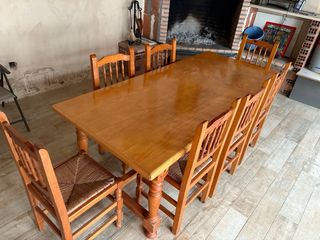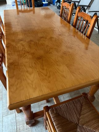 Conjunto de mesa de comedor con siete sillas. - Mesa de madera con acabado brillante.