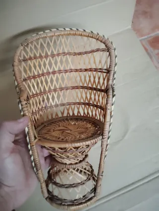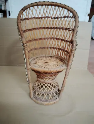 Este sillóncito de adorno vintage está hecho de ratán y mimbre, aportando un toque clásico a cualquier espacio. Su diseño intrincado lo hace ideal para exhibir. - Ideal para decorar solo o con una muñeca sentada. - Materiales: ratán y mimbre. - Color: tonos beige y marrón. - Nuevo sin estrenar.